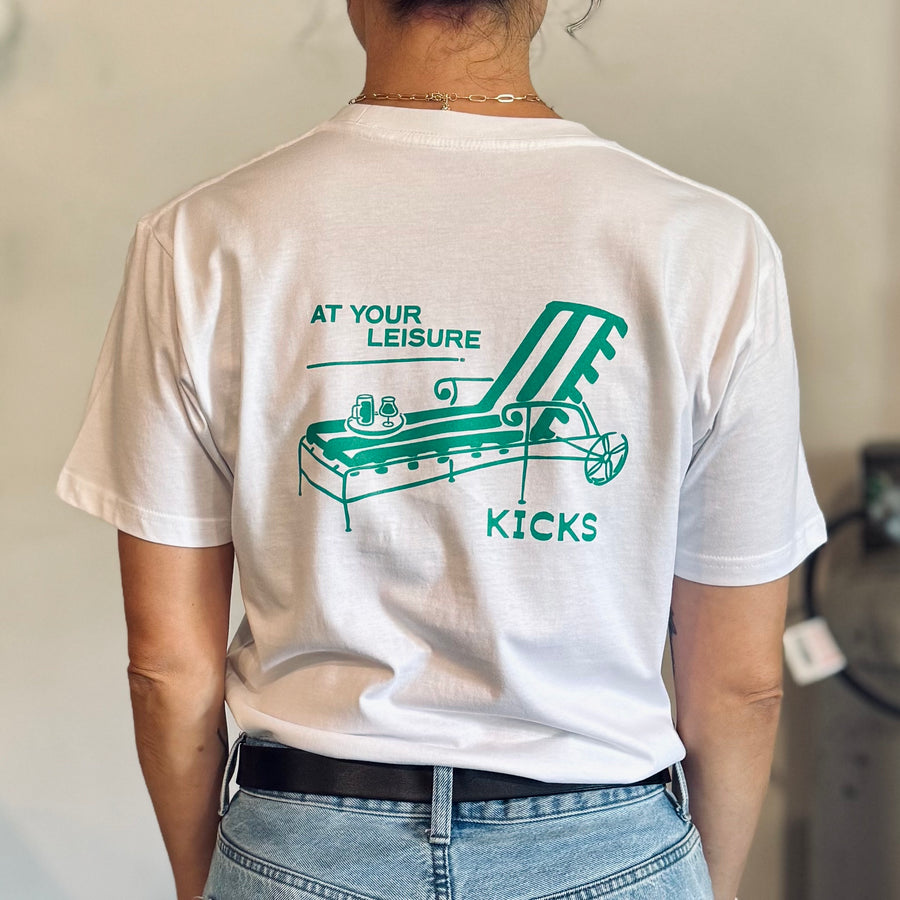 Unisex crew neck, short sleeve t-shirt in 180gsm combed white cotton featuring our At Your Leisure graphic on the back. Kicks logo on the front left.